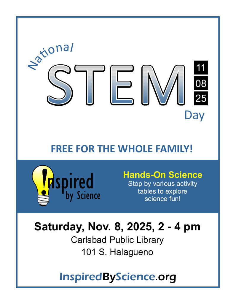 National STEM Day Free for the whole family! Hands-On Science Stop by various activity tables to explore science fun! Saturday, November 8, 2025 2:00 - 4:00 pm Carlsbad Publ. . .