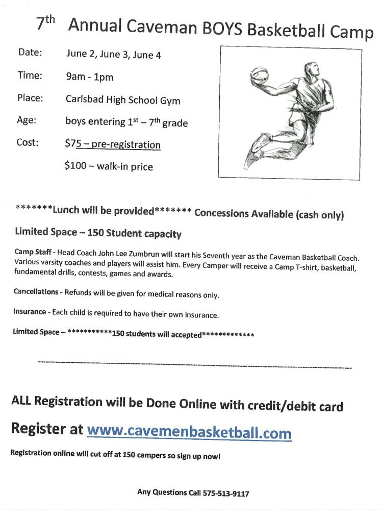 Camp Staff – Head Coach John Lee Zumbrun will start his Seventh year as the Caveman Basketball Coach. Various varsity coaches and players will assist him. Every camper will receive a Camp T-shirt, basketball, fundamental drills, contests, games and awards.