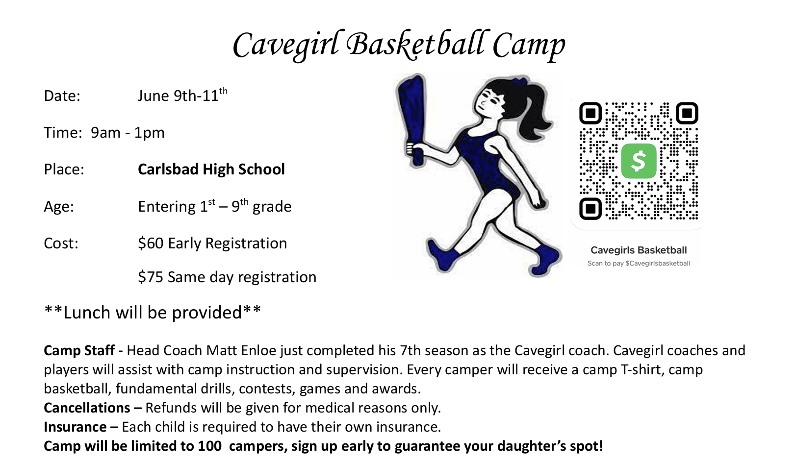 Camp Staff – Head Coach Matt Enloe just completed his 7th season as the Cavegirl coach. Cavegirl coaches and players will assist with camp instruction and supervision. Every camper will receive a camp T-shirt, camp basketball, fundamental drills, contests, games, and awards.