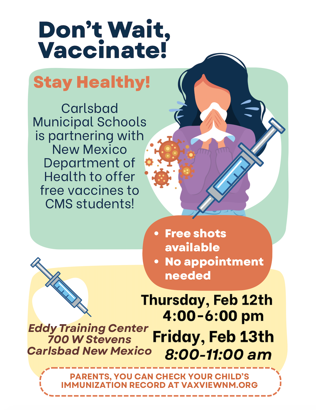 Don't Wait, Vaccinate! Stay Healthy! Carlsbad Municipal Schools is partnering with New Mexico Department of Health to offer free vaccines to CMS students! Free shots availableNo appointment ne...