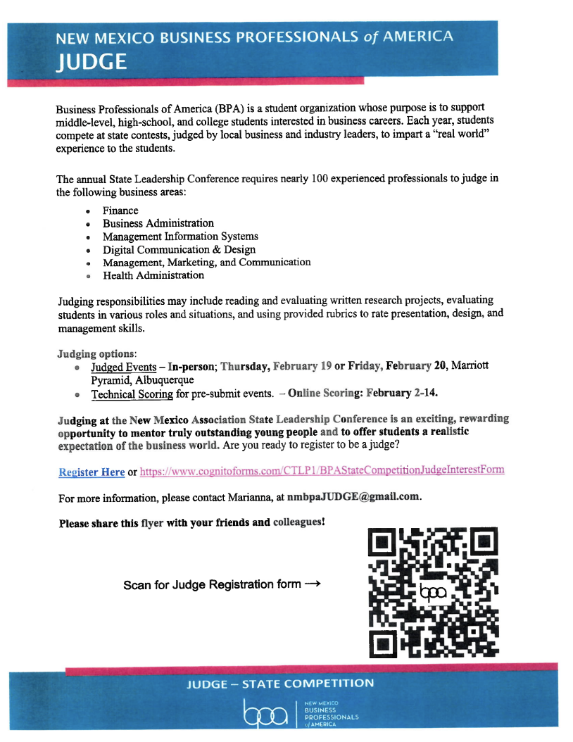 NEW MEXICO BUSINESS PROFESSIONALS of AMERICAJUDGE Business Professionals of America (BPA) is a student organization whose purpose is to support middle-level, high-school, and college students ...